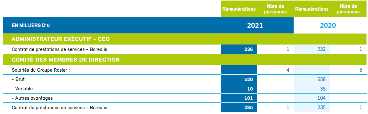 Au 31 décembre 2020, le Comité exécutif du Groupe Rosier était composé de cinq membres : deux membres sont des employés de Rosier S.A., deux membres sont des employés de Rosier Nederland B.V. et un membre est un employé de Borealis détaché chez Rosier.