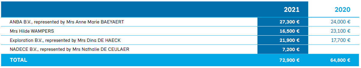 Au 31 décembre 2021, le Comité était composé des trois administrateurs indépendants de la Société : B.V. ANBA, représentée par Mme Anne Marie BAEYAERT, B.V. NADECE, représentée par Mme Nathalie DE CEULAER et Exploration B.V., représentée par Mme Dina DE HAECK.